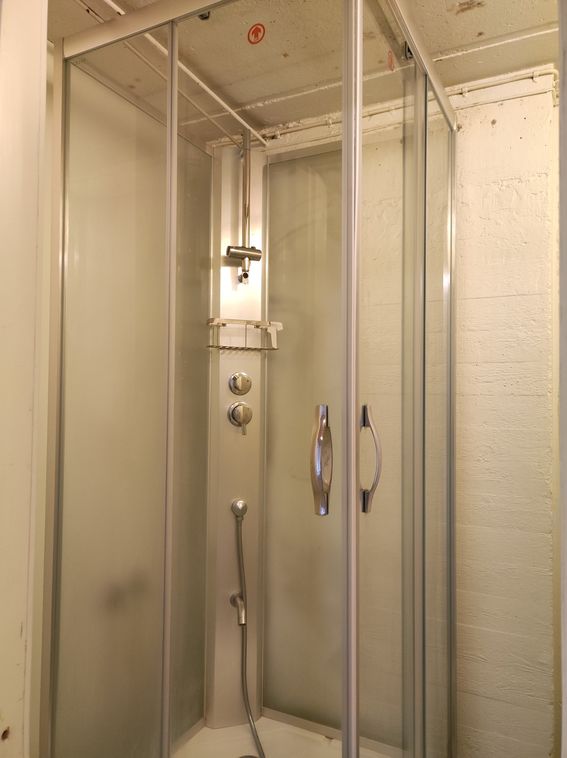 - The space includes a kitchenette, shower, toilet, and a separate back room with access to bike cellar